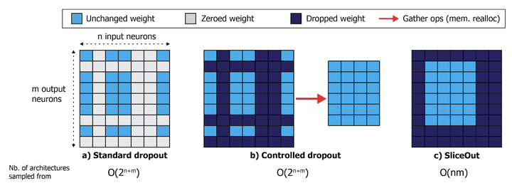 Pushing forward the compute efficacy frontier in deep learning is critical for tasks that require frequent model re-training or workloads that entail training a large number of models. We introduce SliceOut – a dropout-inspired scheme designed to take advantage of GPU memory layout to train deep learning models faster without impacting final test accuracy. By dropping contiguous sets of units at random, our method realises training speedups through (1) fast memory access and matrix multiplication of smaller tensors, and (2) memory savings by avoiding allocating memory to zero units in weight gradients and activations. At test time, turning off SliceOut performs an implicit ensembling across a linear number of architectures that preserves test accuracy. We demonstrate 10-40% speedups and memory reduction with Wide ResNets, EfficientNets, and Transformer models, with minimal to no loss in accuracy. This leads to faster processing of large computational workloads overall, and significantly reduce the resulting energy consumption and CO2 emissions.